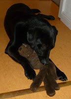 Wir (Kinder, Qietschie, ich) haben uns nun darauf geeinigt, Qietschie während der Abendstunden für mich unerreichbar zu verstauen und mir morgens wieder zurückzugeben. Dann wird mit neuer Kraft aus Leibskräften gequietscht. Ich bin sozusagen eine Weiterentwicklung der Evolution: Ein Hund mit Weckfunktion!