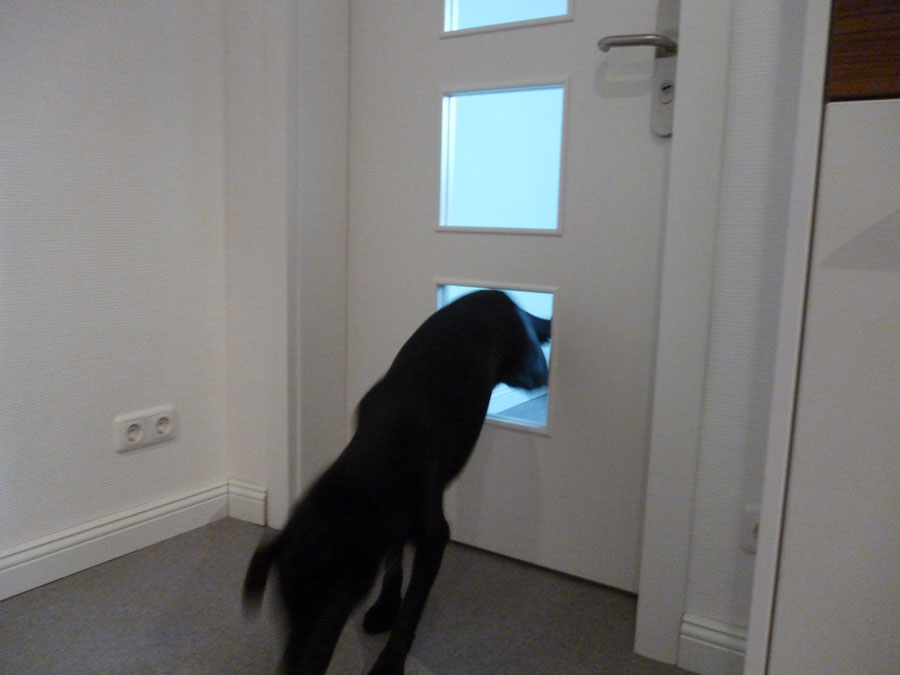 Nach einigen Minuten wurde ich dann rausgerufen und konnte noch eine Geschmacksprobe vom Gesicht des Jungen nehmen, worauf sich bei ihm Begeisterung breit machte:“ Sie mag mich, sie hat mich geküsst.“ Quatsch, das hatte ich nicht! Aber das spielte keine Rolle, ich wurde nämlich trotzdem von oben bis unten durchgestreichelt und geknetet. Fühlte sich merkwürdig an, so von Menschen geknuddelt zu werden, gefiel mir aber sehr gut, und ich blieb ganz still und ruhig.